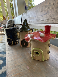 Fairy House Hand building Workshop with Katey 3 hour workshop on March 21 Choose your session or come to both for extra fun! 10am-1pm or 2-5pm Mature teens/adults beginner friendly, any level of experience. A popular studio favorite class. Build and design your dream fairy house in this 3 hour hand building class with our whimsical instructor, Katey Loveless! Assemble your charming cottage or modern abode from clay slabs, coiling methods, texture molds, and add a pop of color by painting with underglaze. Open to mature teens and adults, this beginner-friendly workshop welcomes all levels of experience. One of our most popular studio favorites, this magical 3-hour hand building class invites you to build and design your very own fairy house with instructor, Katey Loveless. Create a charming cottage or a sleek modern abode using clay slabs, coiling techniques, and texture molds, then add personality and pops of color with underglaze. Katey will fire your pottery and it will be ready for pickup at the studio in 2-3 weeks. Come play with clay, spark your imagination, and leave with a fairy house that’s uniquely yours. After the workshop, Katey will fire and glaze your pieces with overglazes. Finished work will be ready for pickup in 2–3 weeks, wrapped and ready for pick up.